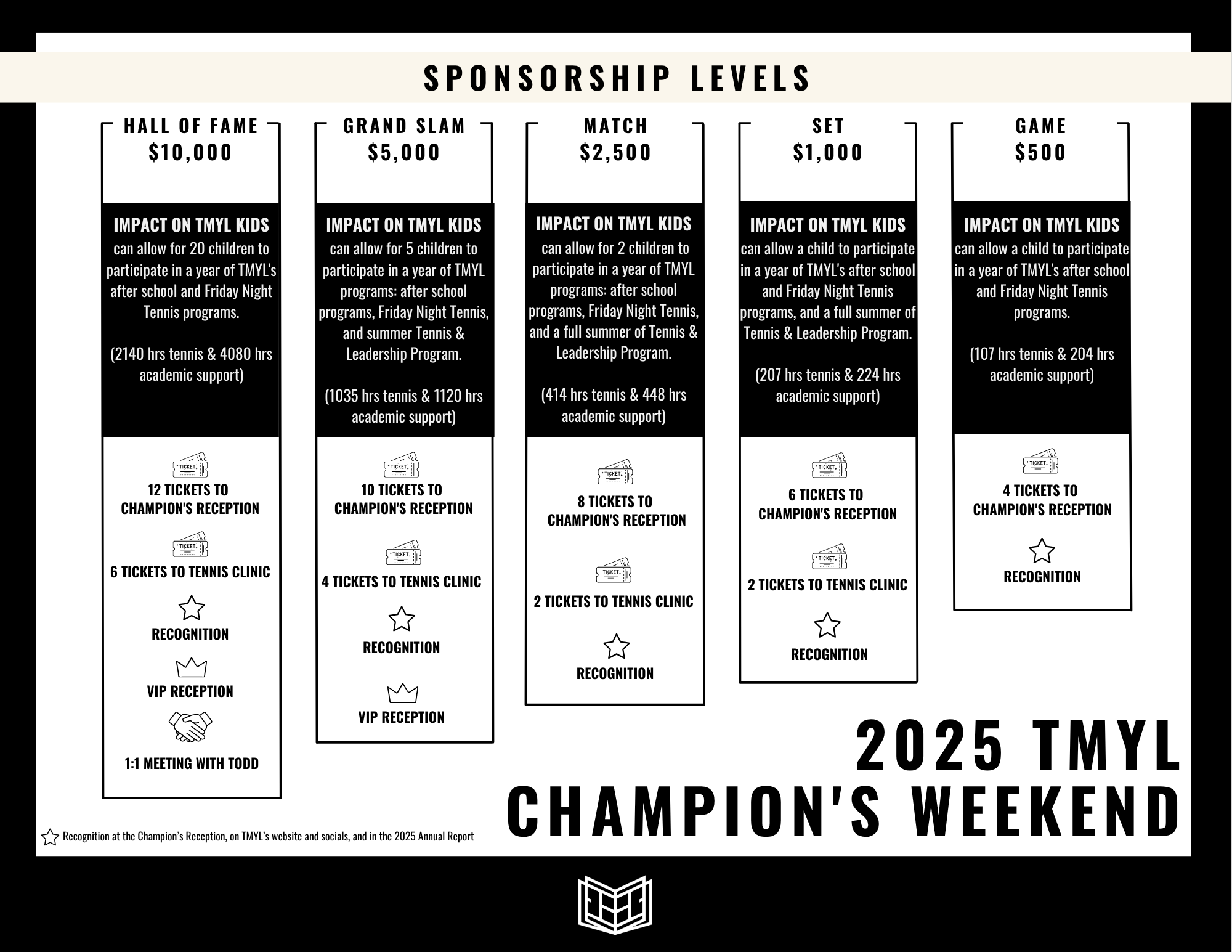Join us for TMYL's Champion’s Reception on October 24th, 6:00 p.m. to 8:00 p.m., at Grewal Hall in Lansing! Enjoy cocktails, live and silent auctions, and meet our special guest, Todd Martin. Your participation supports TMYL’s mission and makes a lasting impact in our community.